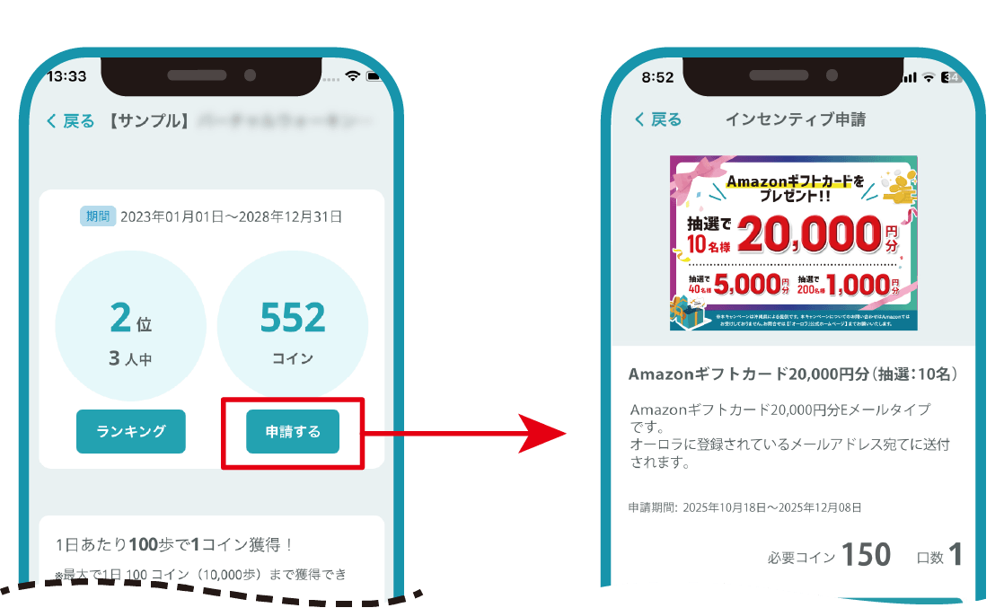 - キャンペーン期間中に150コインを獲得し、オーロラアプリ内から賞品に応募された方